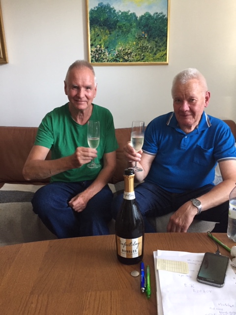 En milstolpe i Strokeföreningen Örebros historia. Sedan starten 5 november 2019 har Ordföranden Lars och Kassören Leif arbetat med att få till ett bankkonto för föreningen. Den 3 augusti 2020 var det klart. Här firar de att processen är klar med var sitt glas champagne. En långdragen process som har fått sitt slut behöver firas.