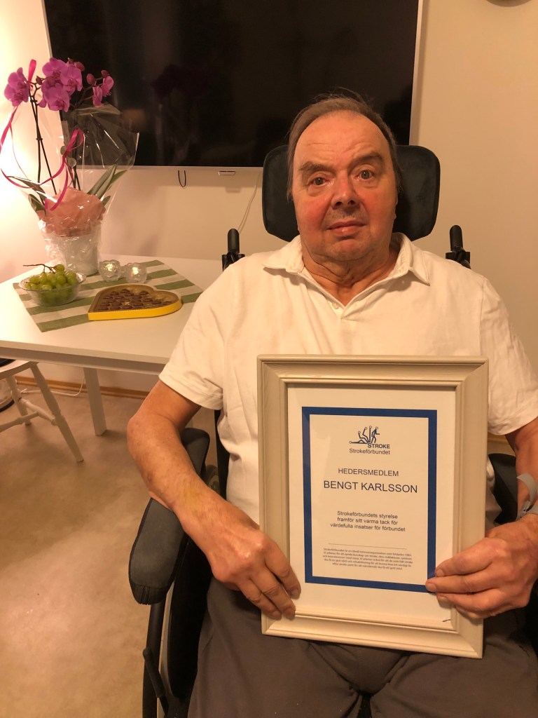 14 februari Vår mångåriga ordförande Bengt Karlsson har blivit utsedd till Hedersledamot i Strokeförbundet. På Alla Hjärtans Dag fick han motta ett diplom och en blomma. Stort GRATTIS BENGT!