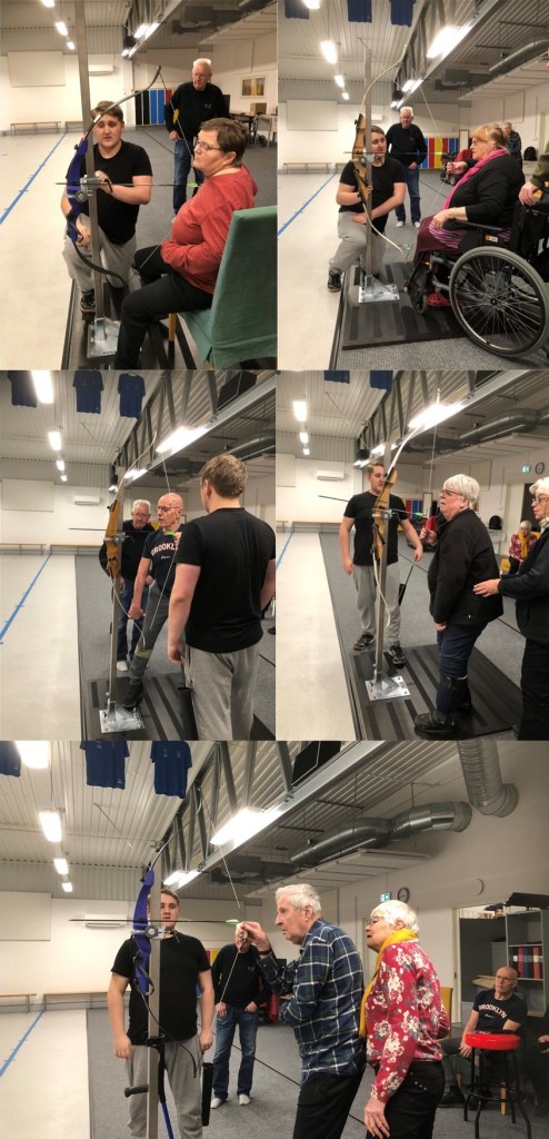 4 april Vi var 8 som testade bågskytte både sittande, stående och med enarmsfunktion. Det tog en stund innan alla hade kommit igång. Alla hann att prova och det gav mersmak till nästa gång. Några kunde till och med öka avståndet från 6 till 12 meter. Vi har två träningstillfällen kvar på terminen den 11 och 18 april.