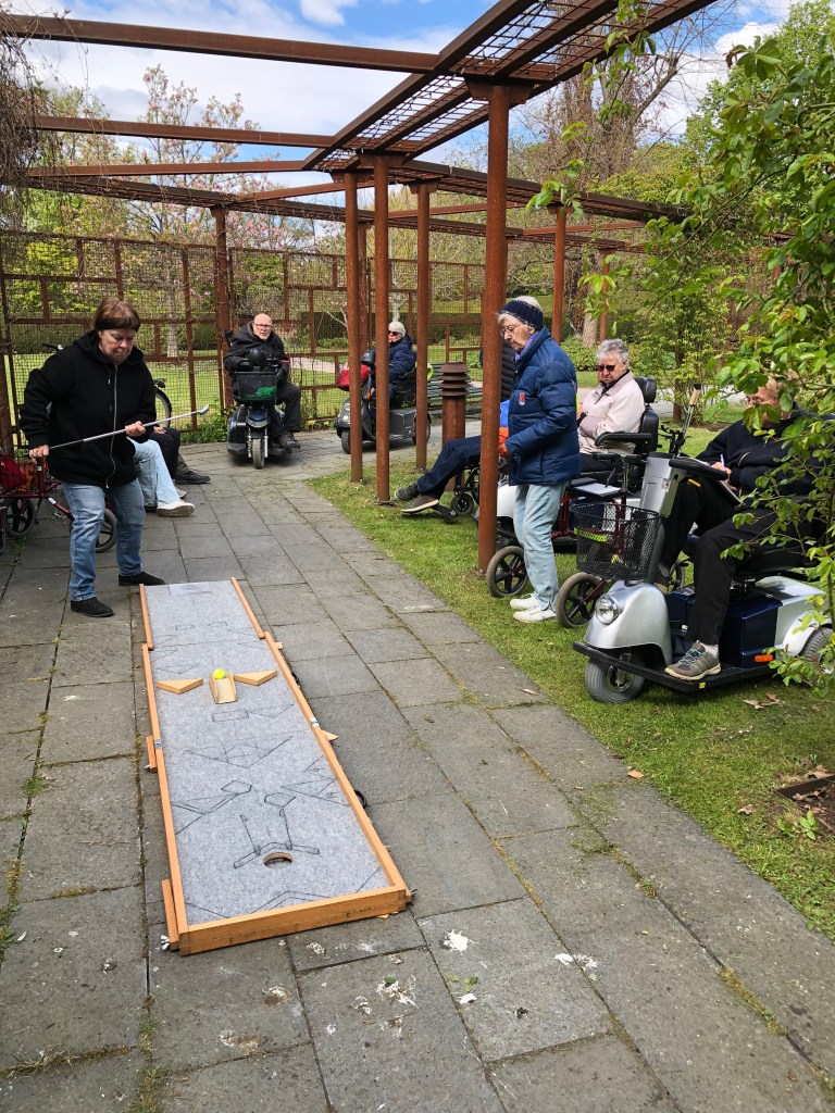 2025 01 16 Det är redan andra gången som vi spelar bangolf. Idag var det 12 som spelade och 3 åskådare/ funktionärer. Vi fyller hela cafét med både skratt och hjälpmedel.