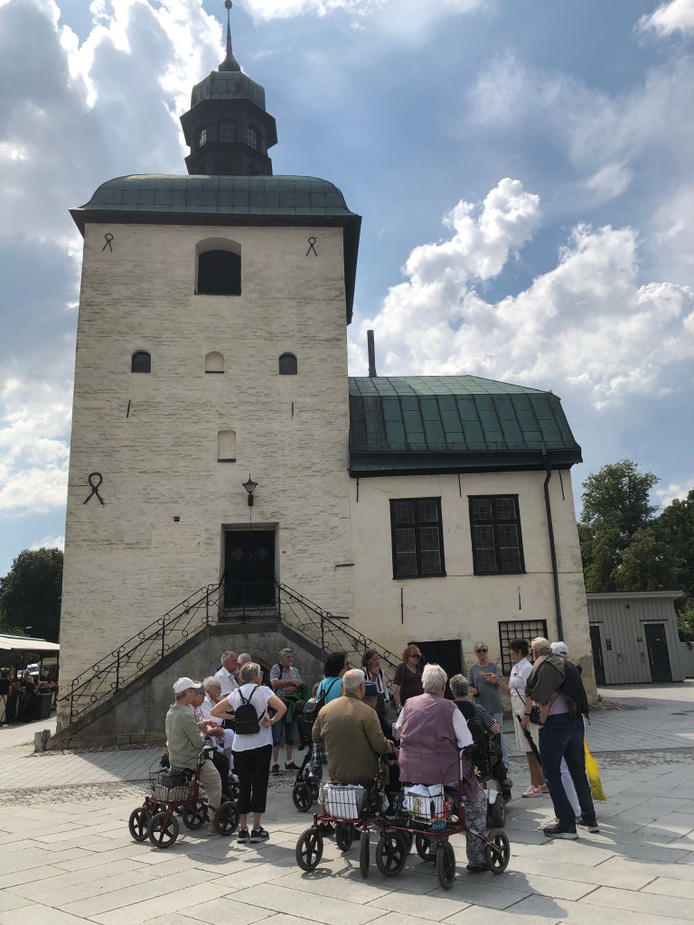 16 juli Sommarresa till Vadstena. Vi var 21 personer som reste till Vadstena på en riktig kulturresa. Först tittade vi på utställningen: Spetsar på slottet. Vadstena har ju varit knypplingens centrum men det finns andra delar av Sverige där man också knypplat. En fin utställning visade knypplingens bredd både historiskt och i nutid. Efter lunchen gick vi en promenad efter Vätterns strand och fick en jättefin guidning, genom många århundranden, av Eva Mattson. Regnet hängde i luften och alla var rustade med regnkläder men det var uppehåll hela tiden. Strokeföreningens grupp är vetgiriga och ena riktiga kämpar som strävar på och deltar. Imorgon får vi vila.