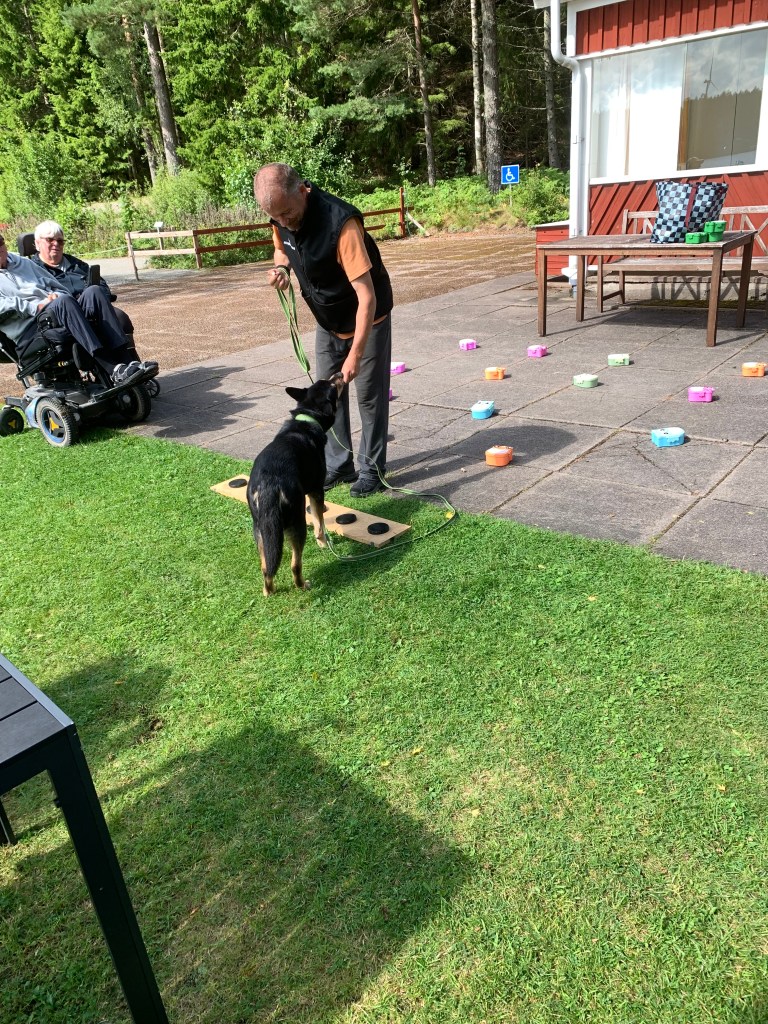 2 augusti Det var 15 medlemmar som kom till Lillsjöstrand. Vi åt vår lunch tillsammans och sedan blev det en tur med flotten. Eftermiddagens höjdpunkt blev Bengts förevisning hur han tävlar med sin hund i doftsök. En tävlingsform som visar på vilken fantastisk förmåga hundar har i förhållande till vi människor. Eftermiddagskaffet kunde vi njuta av vid Lillsjöns strand med både skratt och allvar.
