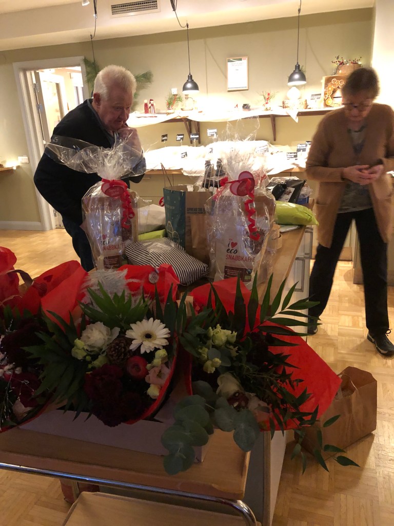 Våra medlemmar och sponsorer hade skänkt gåvor som vi lottade ut. Lisbeth och Leif ställer fram alla lotterivinster. Många gick hem med fina vinster och Inga och Leif fick också motta ett stort TACK för det gångna året.